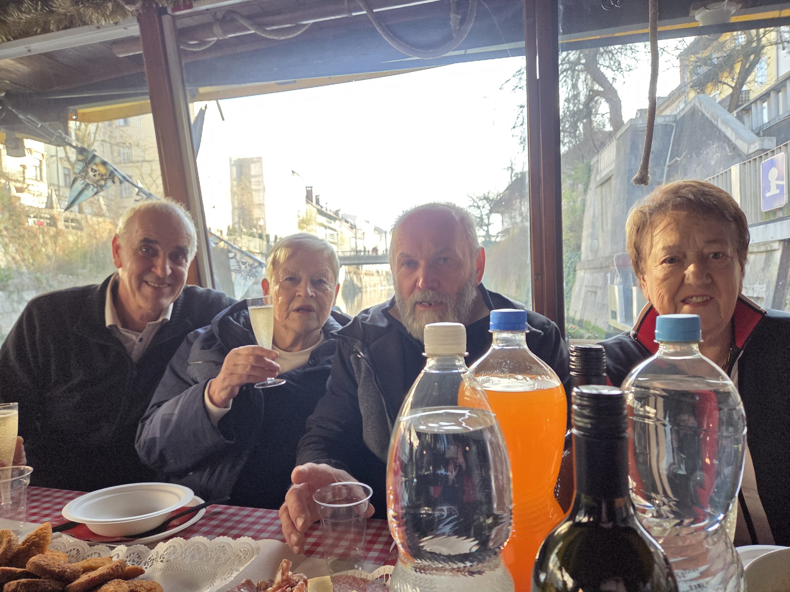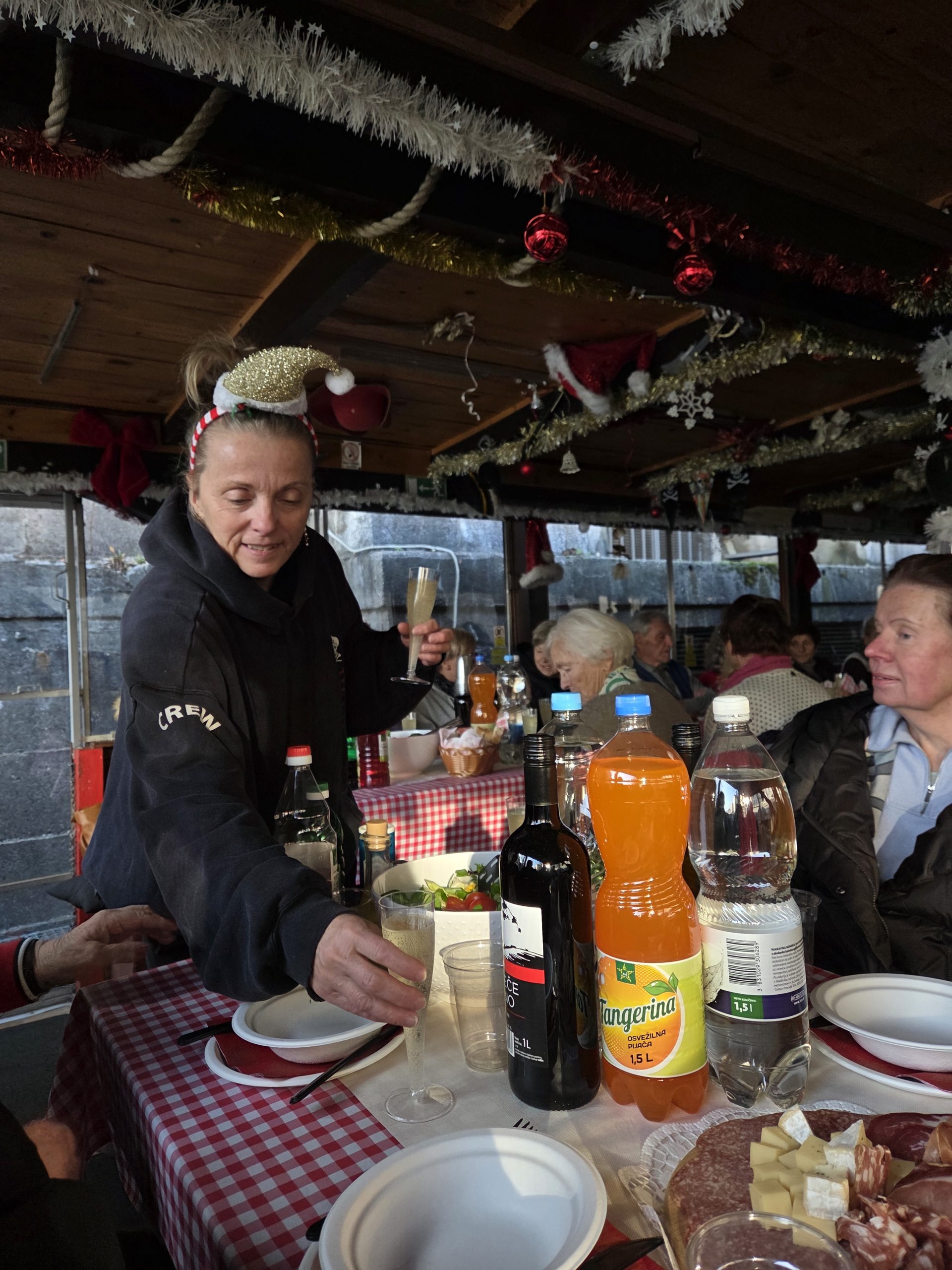 Z dušo in srcem so nas v praznično okrašenem  restavracijskem delu ladjice sprejeli gostitelji, ob penini pa nam izrekli  novoletno voščilo, in postregli z zelo dobro, sveže pripravljeno hrano, pijačo in slaščicami.